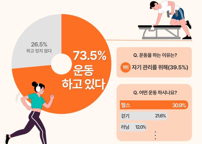 운동에 투자하는 시간은 ▲30분~1시간(45.2%)이 가장 많았고 ▲1~2시간(42.9%)이 다음을 차지했다. 또, 주로 운동하는 시간대는 ▲퇴근 후 저녁(76.4%)이 가장 많았다.