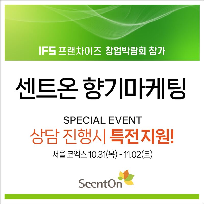 프리미엄 향기마케팅 전문기업 센트온(ScentOn, 대표 유정연)이 오는 10월 31일부터 11월 2일까지 서울 코엑스에서 열리는 ‘2024 하반기 IFS 프랜차이즈 창업 산업 박람회’에 참가, 향기마케팅을 함께 이끌어갈 가맹점을 모집한다고 30일 밝혔다.