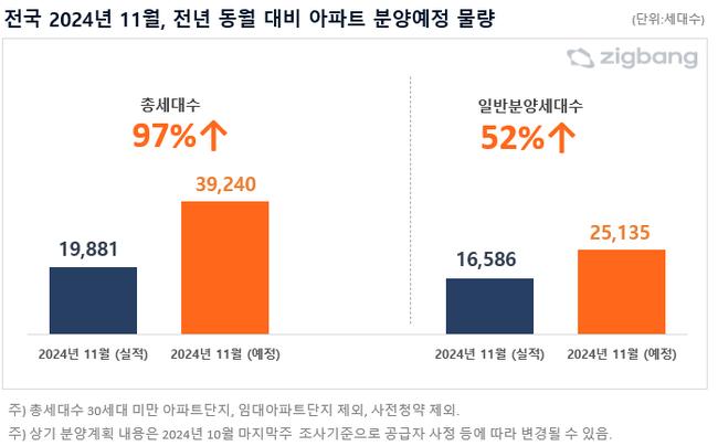 11월에는 전국적으로 총 3만 9,240세대(일반분양 2만 5,135세대)가 분양될 예정이다. 이는 2023년 11월의 1만 9,881세대에 비해 약 97% 증가한 수치로, 수도권에 2만 904세대, 지방에 1만 8,336세대가 공급될 전망이다.