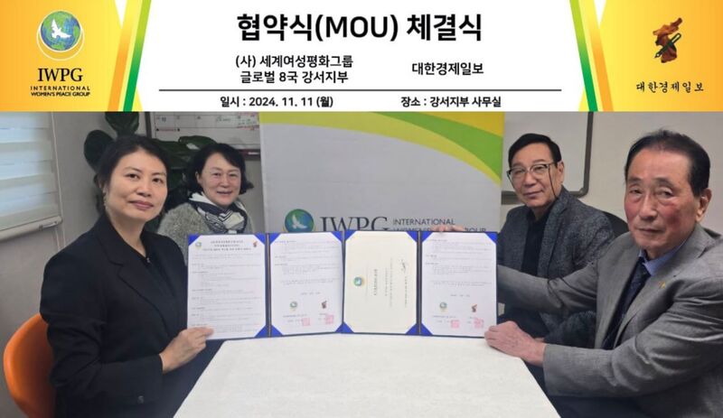 ㈔세계여성평화그룹(IWPG) 강서지부(지부장 이연정)가 11일 강서지부 사무실에서 대한경제일보(대표 문영만)와 지속 가능한 평화 사업 실현을 위한 업무협약(MOU)을 체결했다.