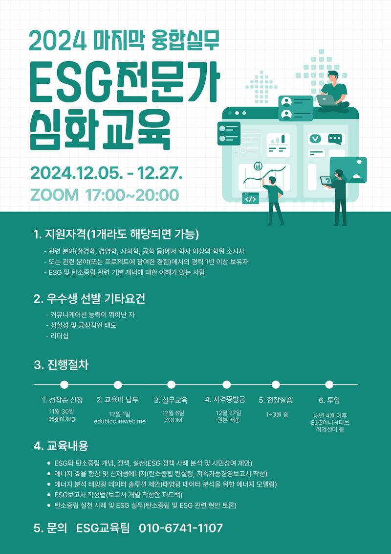 신청 및 문의는 홈페이지 esgini.org 또는 전화 010-6741-1107을 통해 가능합니다. 자세한 커리큘럼과 비용 등은 문의하시면 안내해드립니다.