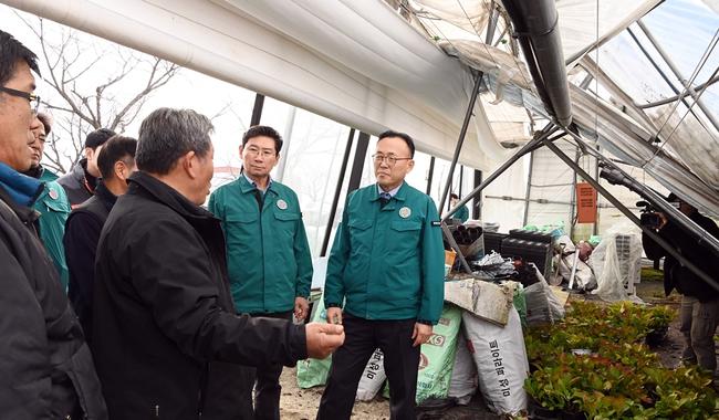 이한경 행정안전부 재난안전관리본부장이 1일 오후 경기 용인시 처인구 화훼(안개종묘농장) 피해 현장을 방문하여 대설 피해지역을 점검하고, 현장의 목소리를 청취하고 있다.