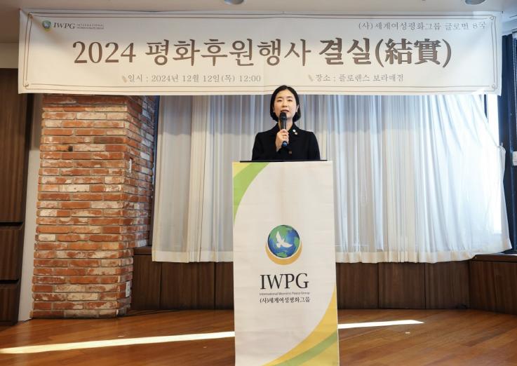 김은희 글로벌국장은 “한 해 동안 IWPG 평화 활동에 동참해 주셔서 감사하다. 여러분의 후원과 헌신은 평화의 씨앗이 돼 지구촌을 살아갈 우리 자녀들과 후대에 소중한 초석이 될 것이다. 이 시간 2024년 함께 걸어온 길을 돌아보고 앞으로 걸어갈 또 하나의 새로운 길을 한마음으로 소망하는 시간이 되면 좋겠다”고 인사말을 했다.