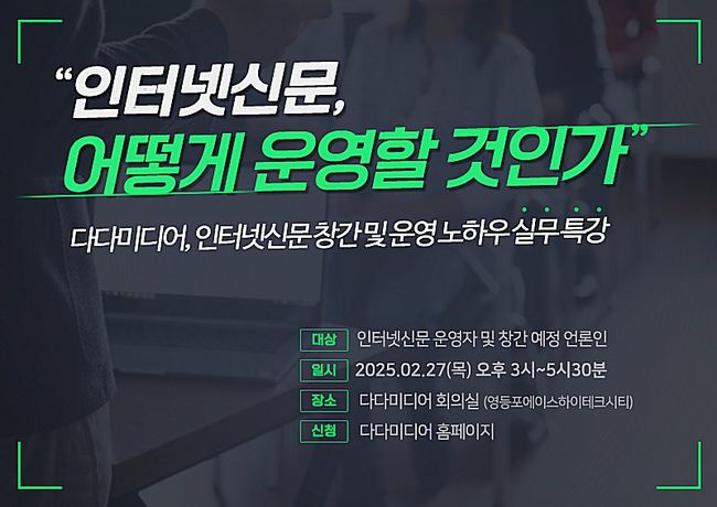다다미디어, 2월 인터넷신문 창간 및 운영 노하우 설명회 개최 - 2월 27일(목) ‘인터넷신문, 어떻게 운영할 것인가’ 주제로 실무 강좌 열어 - 출입처 등록, 독자 관리, AI 활용 기사 작성 등 인터넷신문 운영 전반 교육