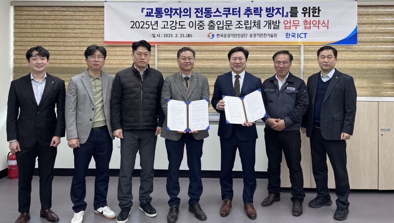 한국ICT(대표 김정용)이 한국승강기안전공단(KoELSA, 이사장 고성균), 승강기안전기술원과 함께 교통약자들의 전동 스쿠터 추락방지를 위해 엘리베이터 고강도 이중 출입문 조립체 개발을 위한 업무협약을 체결했다고 26일 밝혔다.