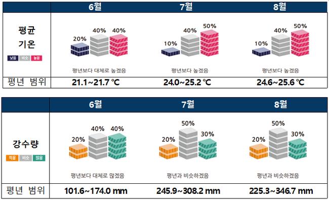 6월 기온은 평년(21.121.7℃)보다 높을 확률이 40%로 나타났으며, 7월(24.025.2℃)과 8월(24.6~25.6℃)은 각각 50%의 확률로 평년보다 높을 가능성이 제시됐다. 이는 열대 서태평양과 인도양의 해수면온도 상승, 북극해 해빙 면적 감소 등으로 인해 우리나라 주변의 고기압성 순환이 강화된 영향으로 분석된다.