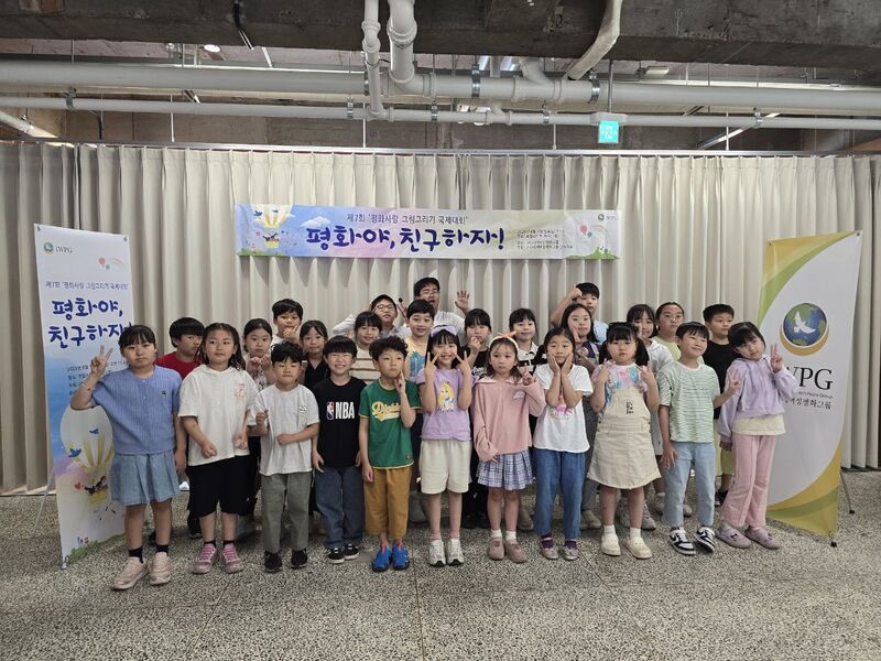 제7회 평화사랑 그림그리기 국제대회 예선에 참가한 어린이들이 화곡동 로컬스티치에서 단체사진을 찍으며 평화의 메시지를 함께 나누고 있다.