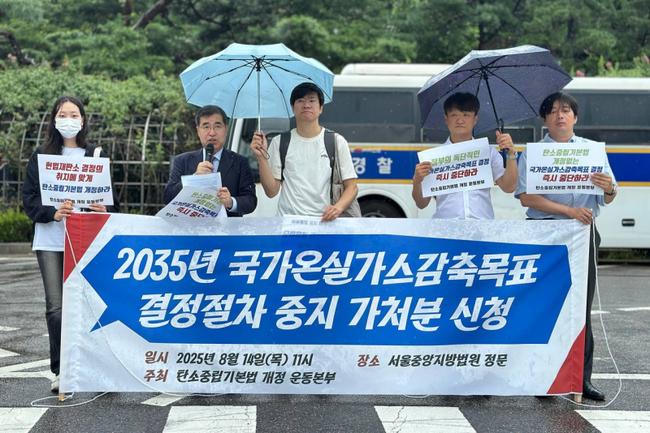 `탄소중립기본법 개정운동본부`는 8월 14일 서울중앙지방법원 앞에서 기자회견을 열고, 정부의 `2035년 국가온실가스감축목표(NDC)` 졸속 결정을 막기 위한 가처분 신청을 제출했다.