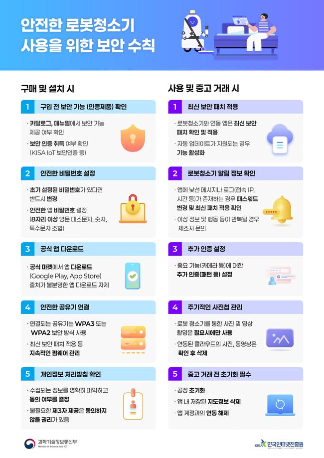 로봇청소기, 보안도 선택 기준…IoT보안인증 제품 우수성 확인 - 과기정통부·KISA·한국소비자원, 로봇청소기 보안 실태조사 결과 발표 - IoT보안인증 제품, 상대적으로 높은 보안성 입증 - 소비자 대상 비밀번호 설정·공식 앱 사용·보안 업데이트 강조
