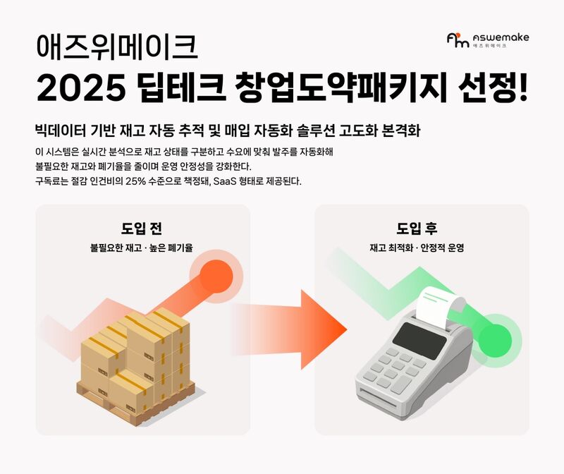 국내 식자재마트 디지털 전환을 선도하는 리테일테크 스타트업 애즈위메이크(대표 손수영)가 중소벤처기업부가 주관하는 ‘2025년 딥테크 창업도약패키지’ 지원사업에 최종 선정됐다고 9일 밝혔다.
