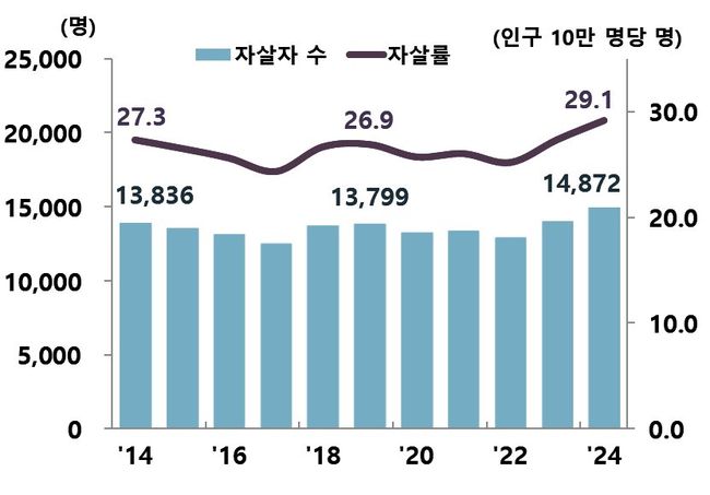 2024년 자살률 29.1명…2011년 이후 최고치 - 연간 자살자 1만4,872명, 전년보다 6.4% 증가 - 남성 자살률 여성의 2.5배…중장년층·고령층에서 심각 - 정부, ‘2025 국가 자살 예방 전략’ 본격 추진해 긴급 개입 강화