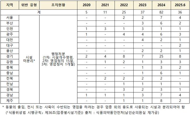 20일 국회 보건복지위원회 소속 남인순 더불어민주당 의원(서울 송파병)이 식품의약품안전처로부터 제출받은 ‘반려동물 출입으로 인한 식품위생법 위반 현황’ 자료에 따르면, 시설 미분리로 인한 위반 건수는 2020년 5건에서 2024년 82건으로 급증했다. 특히 지난해 처음으로 80건 이상 행정처분이 내려지며 관련 위반이 급격히 늘었다.