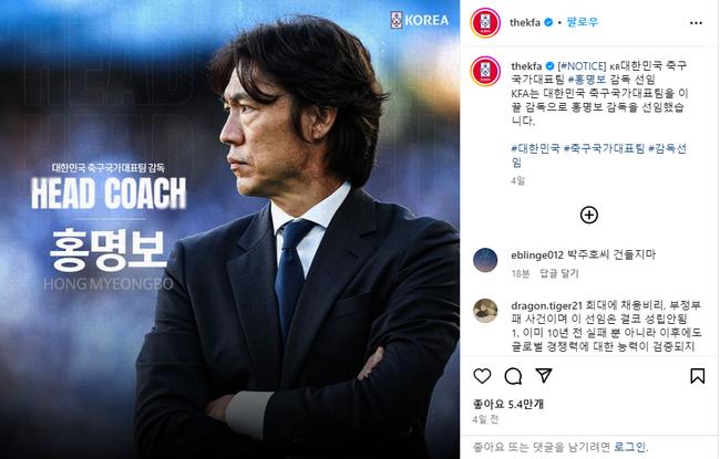지난 7월 8일 우리나라 축구 국가대표팀에 홍명보 감독이 선임됐다. (대한축구협회 인스타그램)