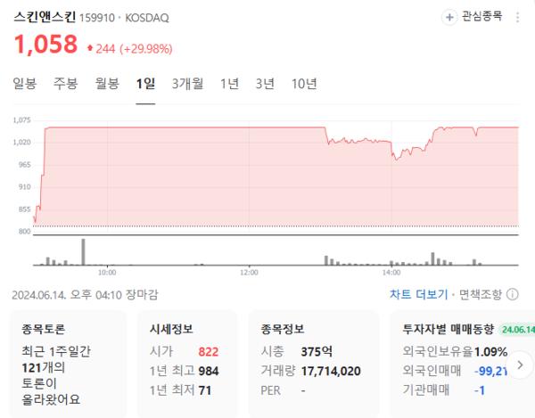 "6월14일의 스킨앤스킨 종목 현황" 네이버 종목정보 캡쳐